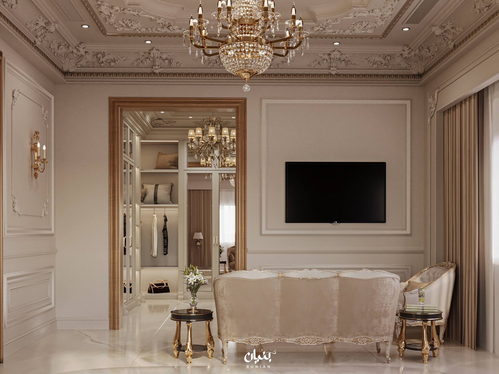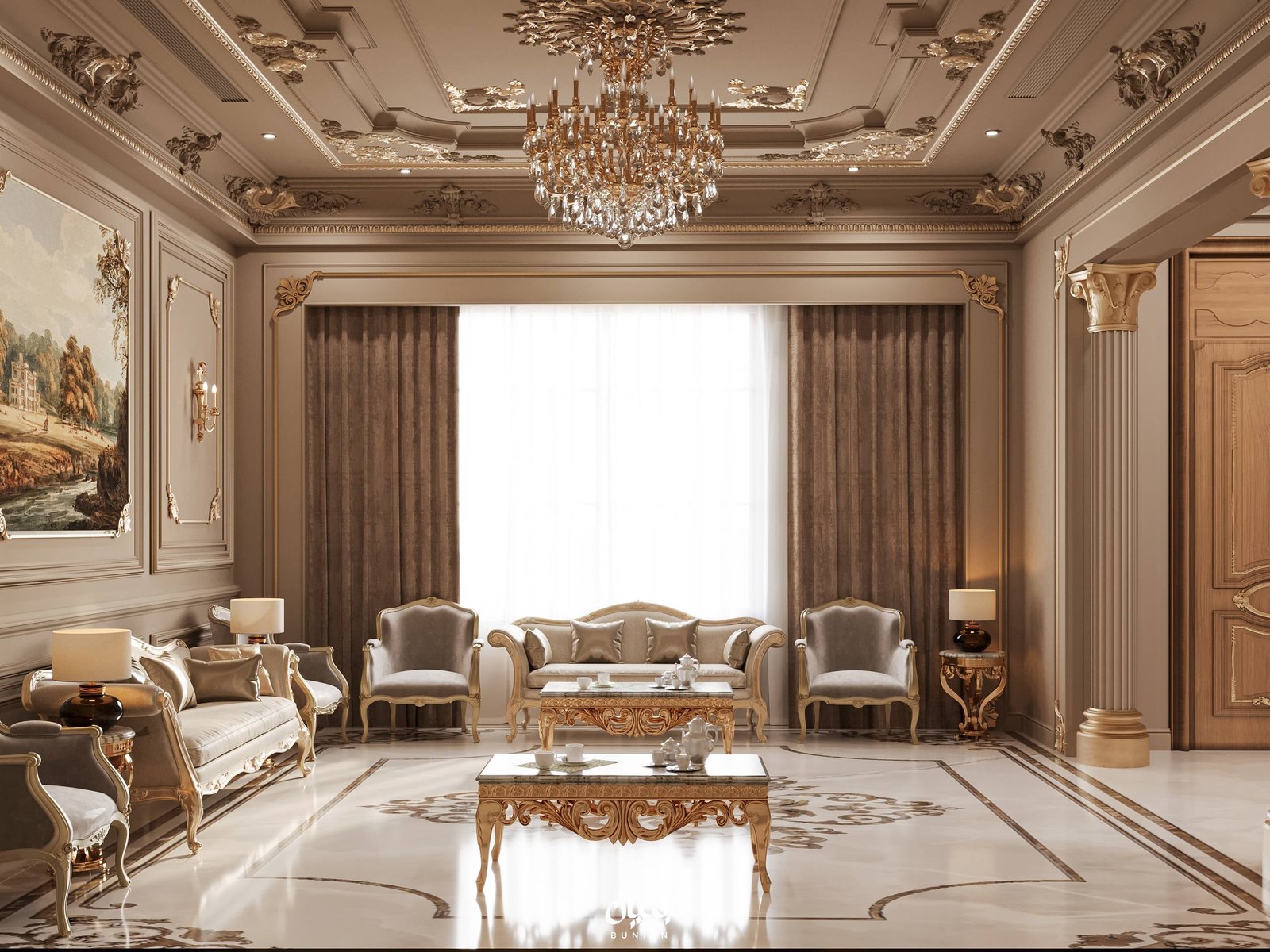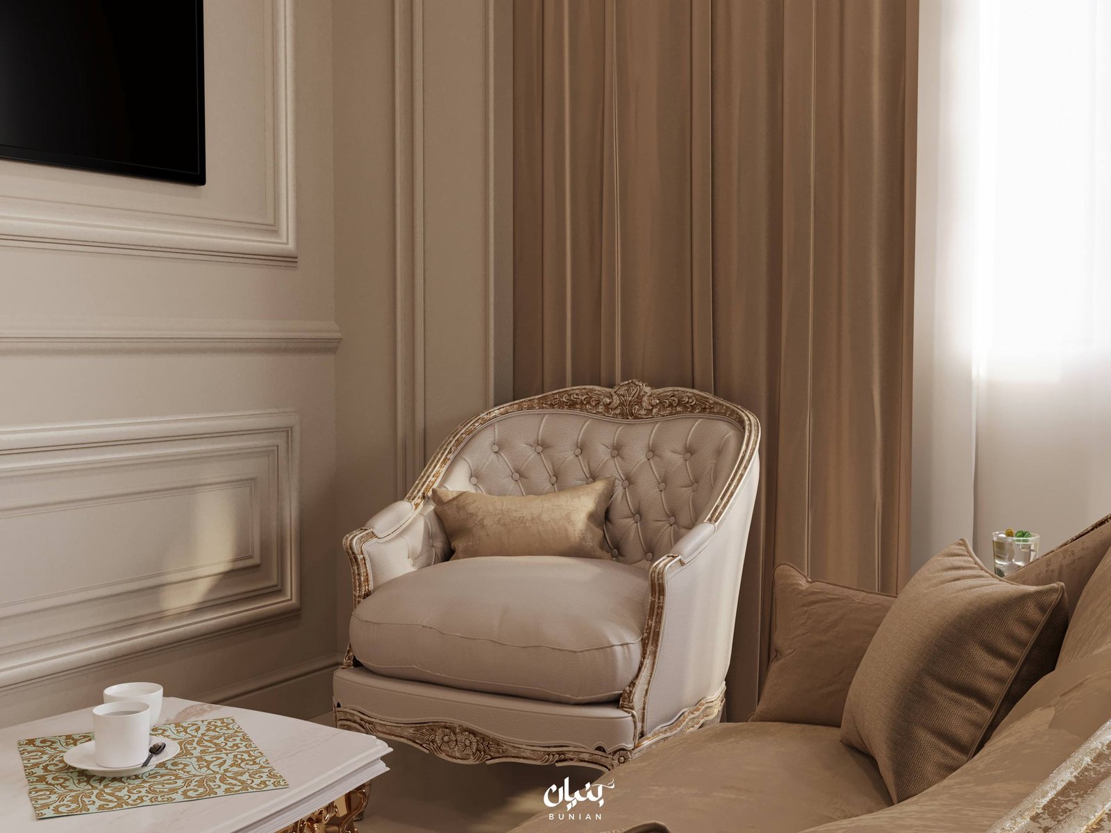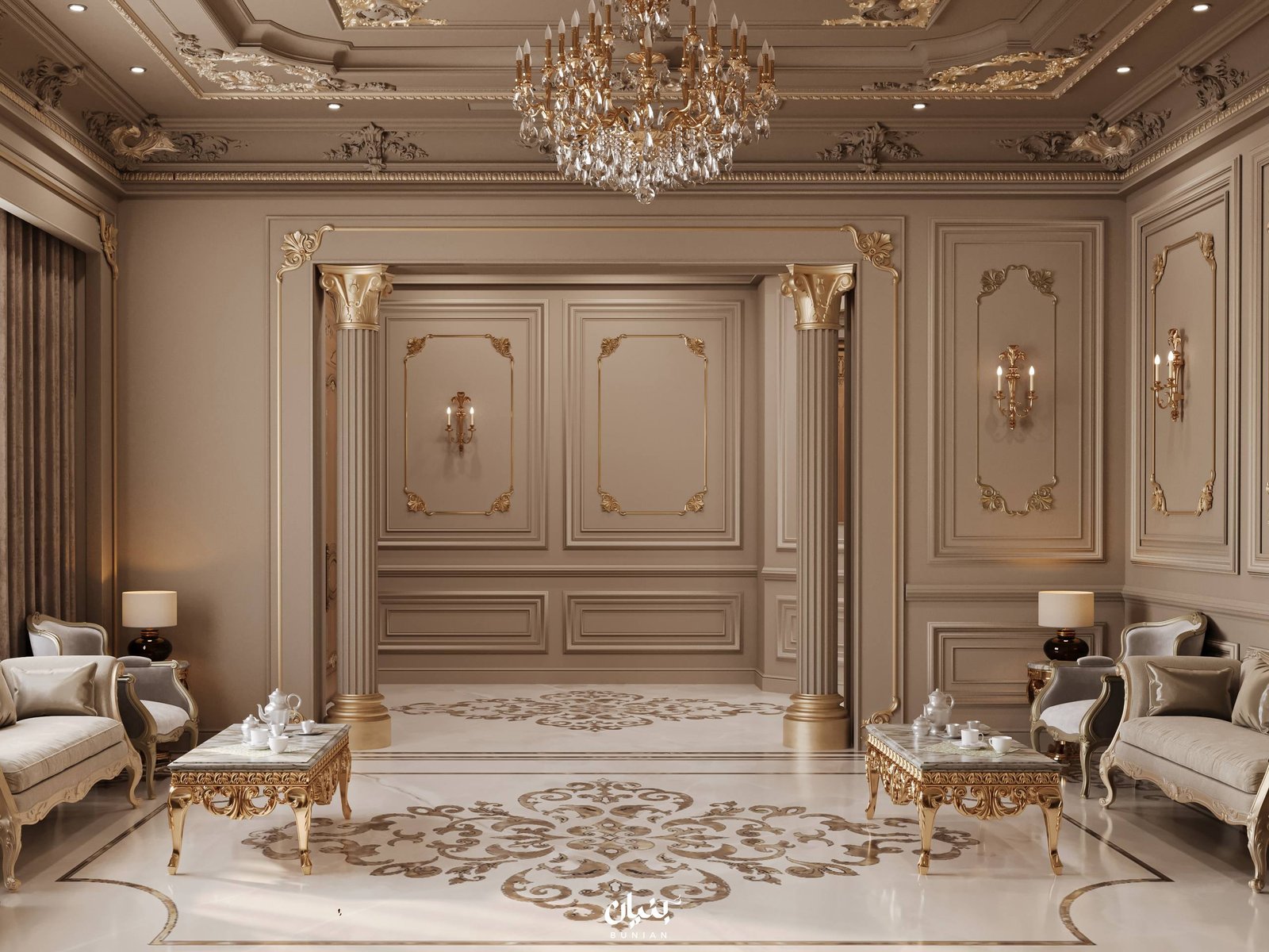 تم التركيز على خلق فراغات داخلية تعكس الرقي والهيبة من خلال استخدام عناصر معمارية كلاسيكية مثل الأعمدة والزخارف الجبسية والكرانيش المزخرفة، مع توزيع إضاءة مدروس يبرز التفاصيل بدقة.