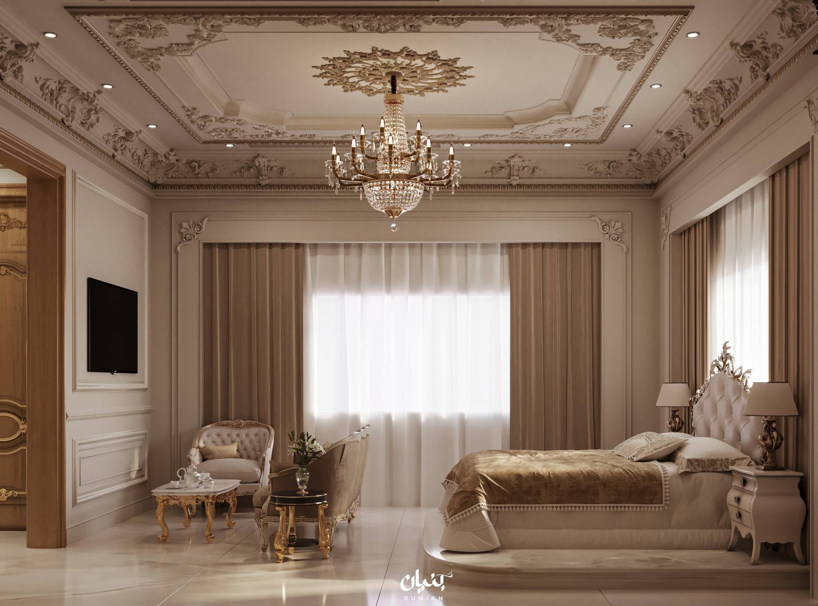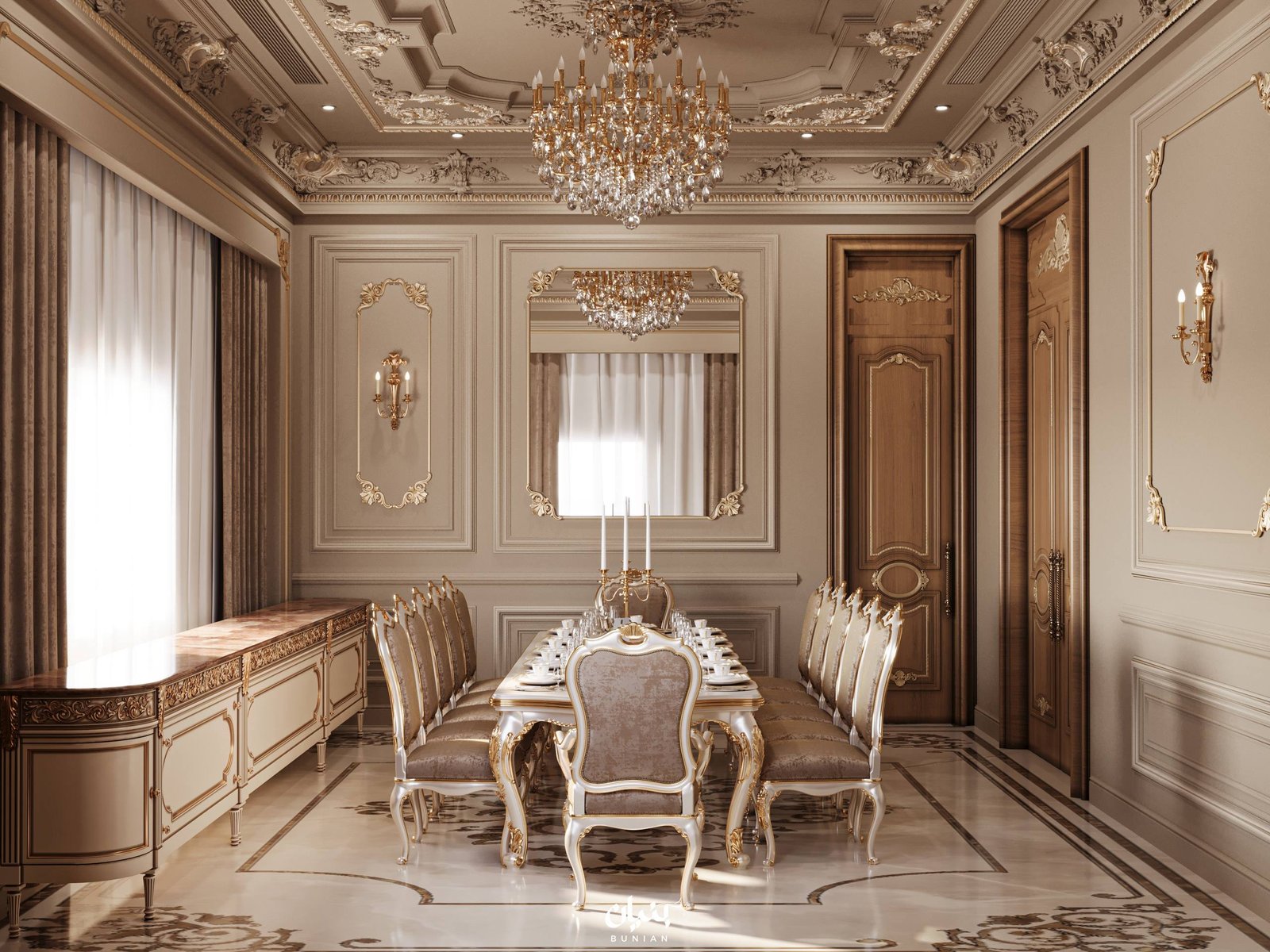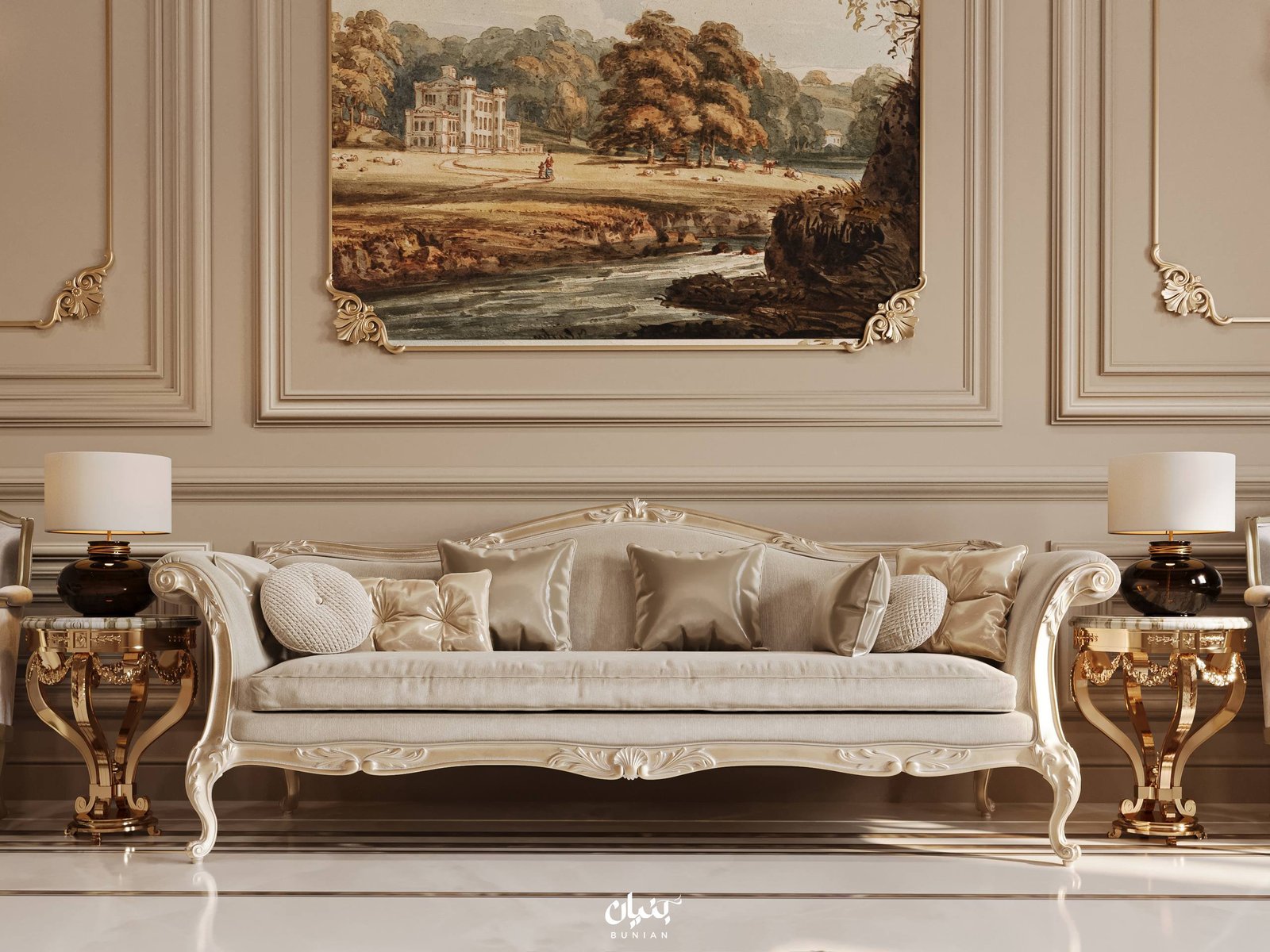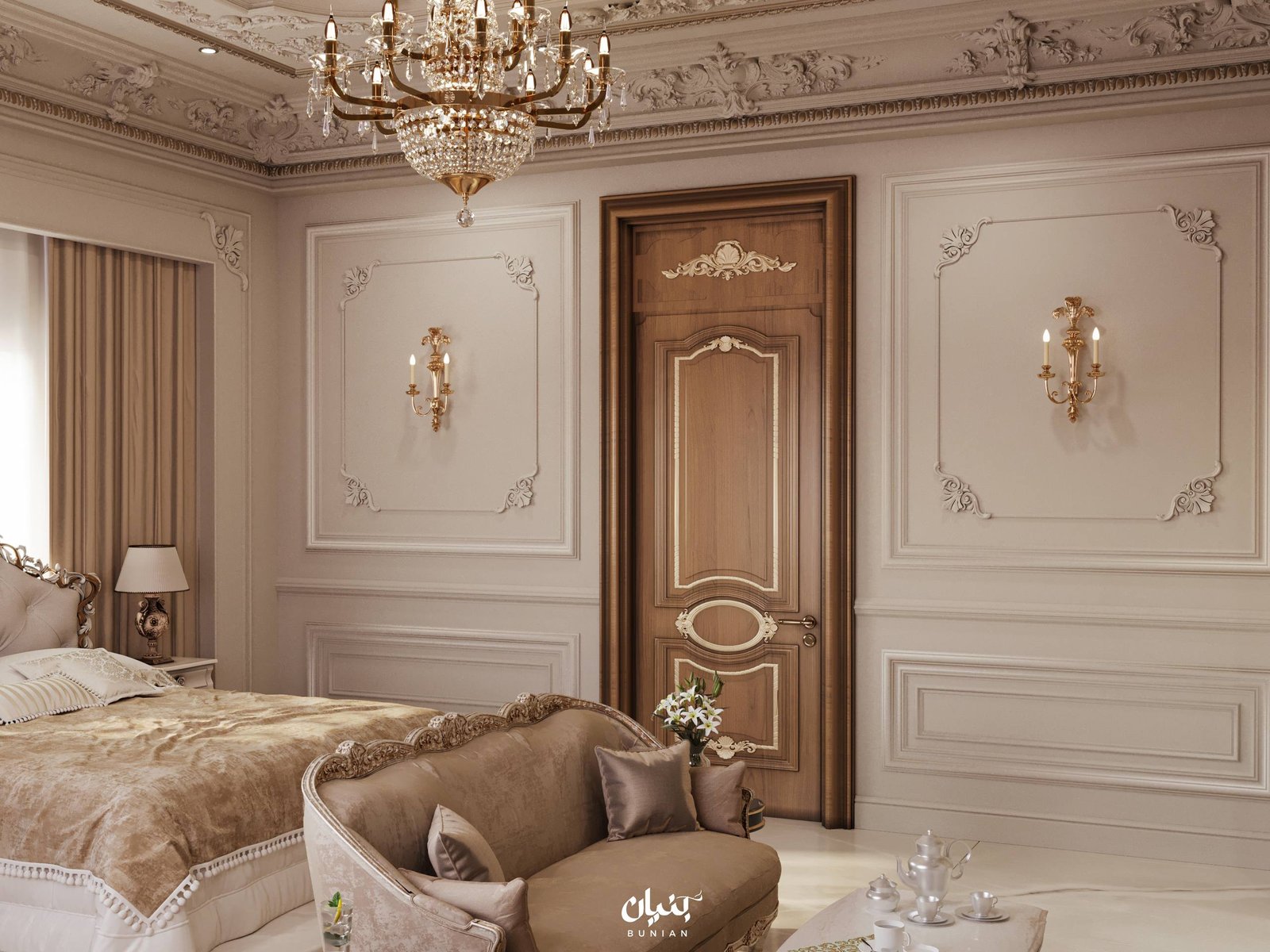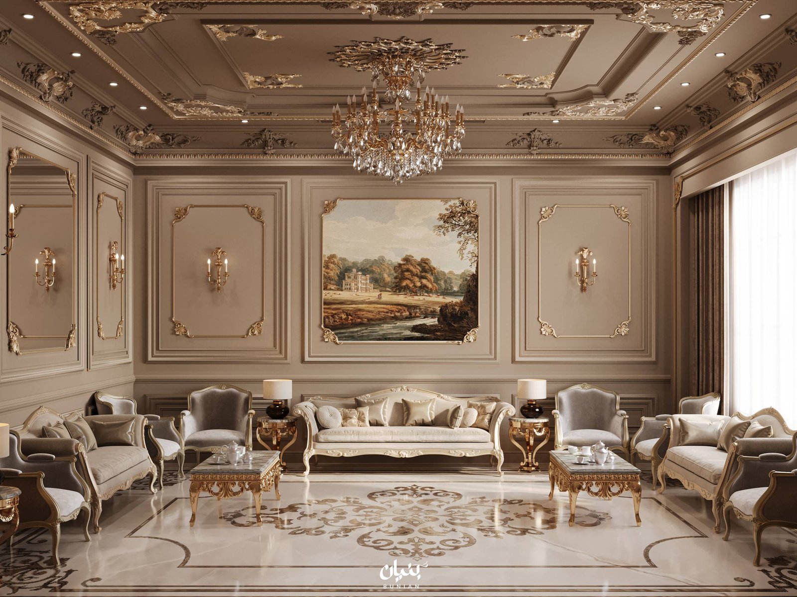 تم التركيز على خلق فراغات داخلية تعكس الرقي والهيبة من خلال استخدام عناصر معمارية كلاسيكية مثل الأعمدة والزخارف الجبسية والكرانيش المزخرفة، مع توزيع إضاءة مدروس يبرز التفاصيل بدقة.
