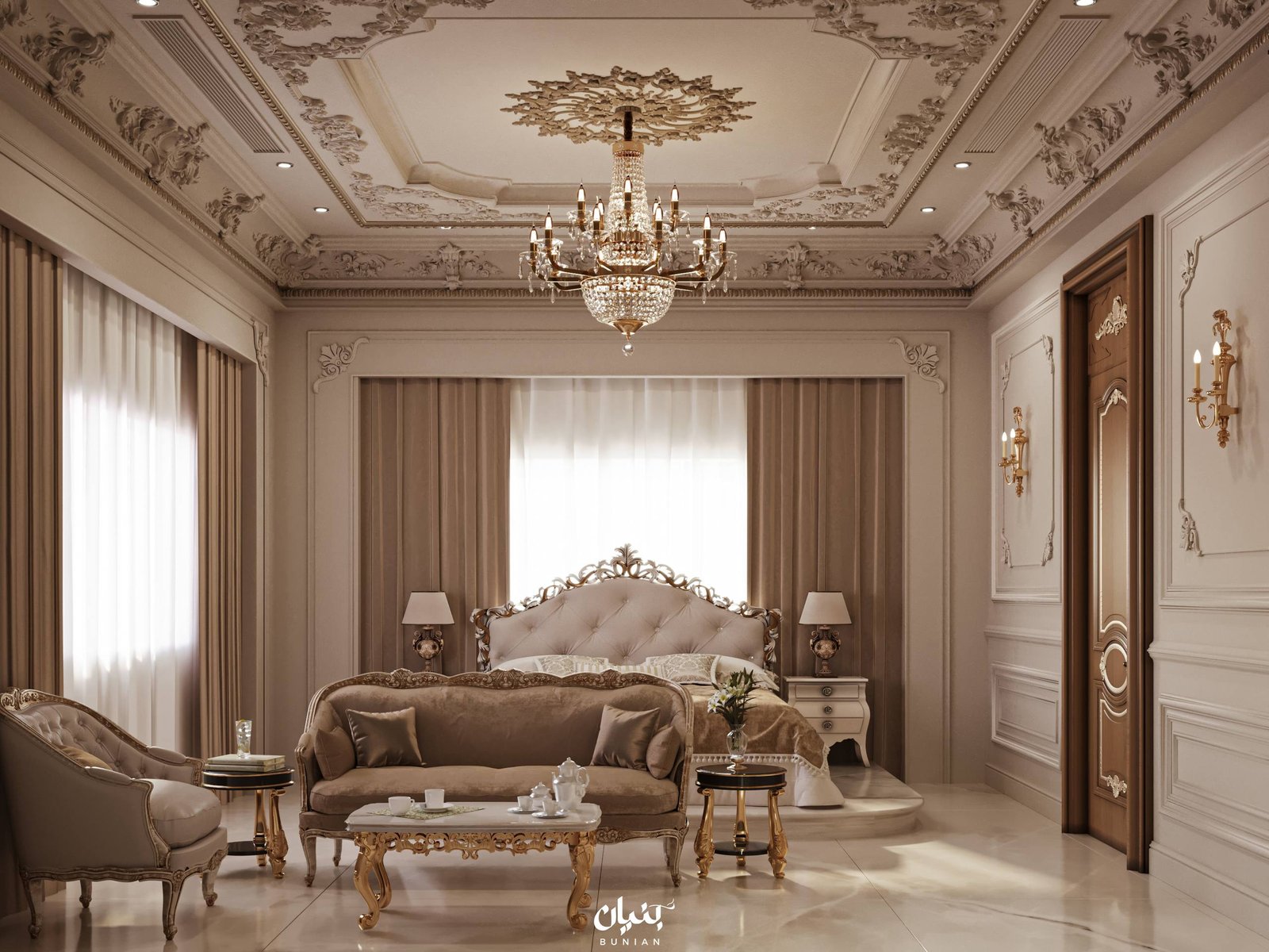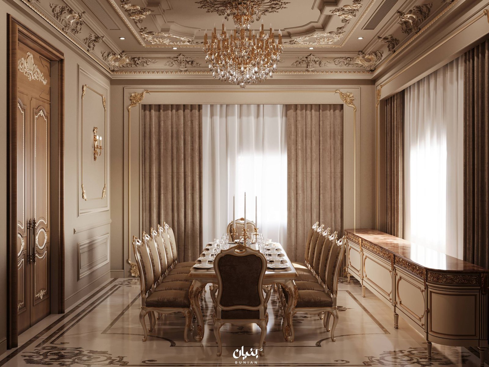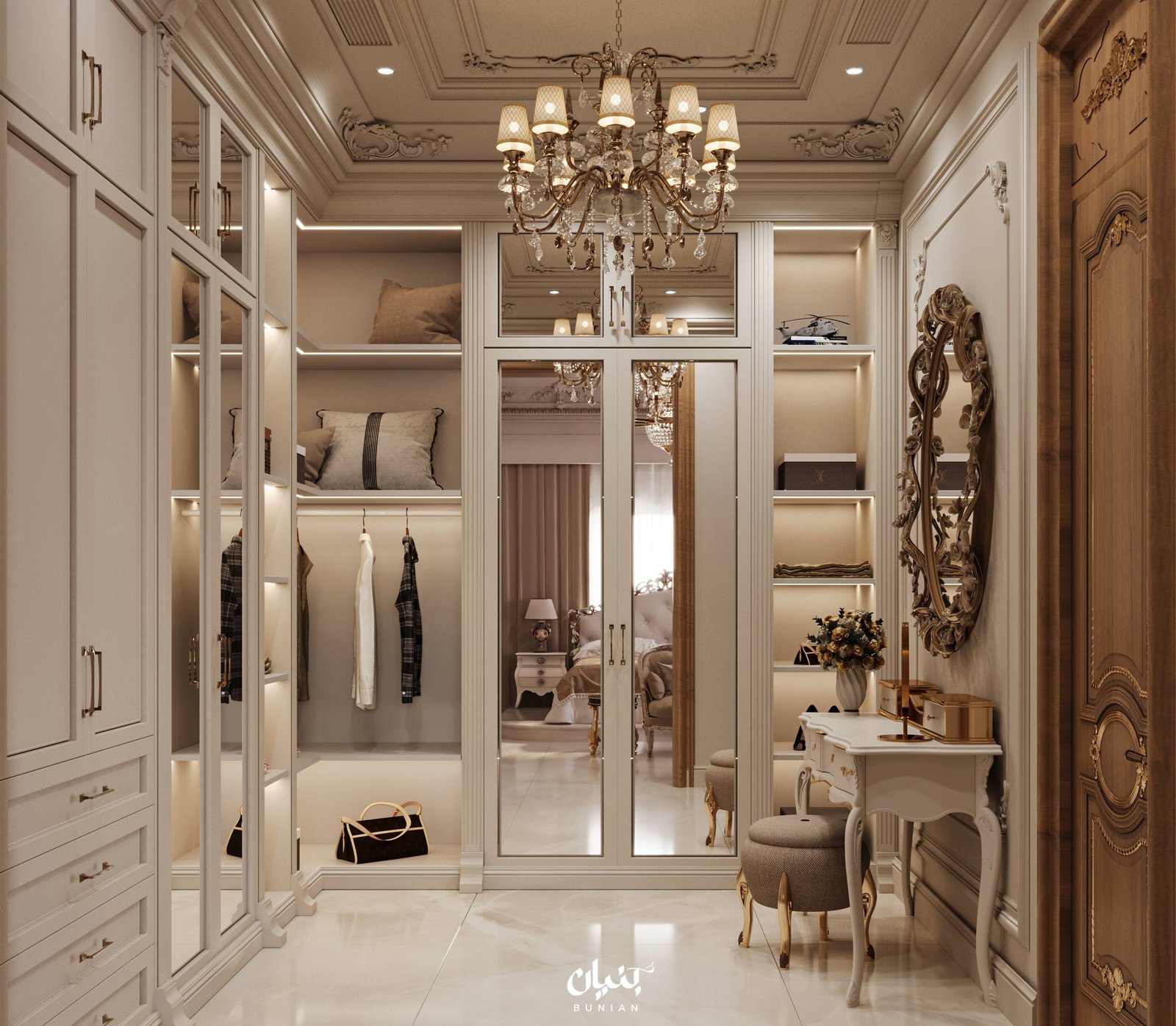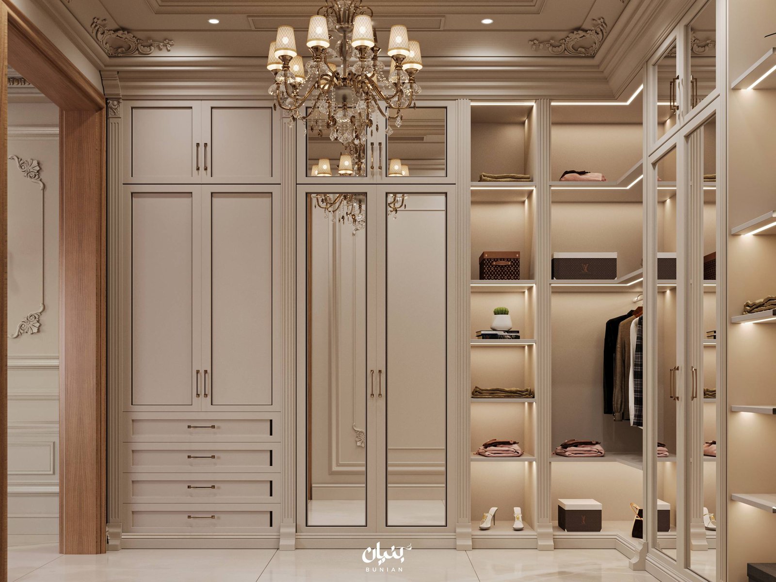 تم التركيز على خلق فراغات داخلية تعكس الرقي والهيبة من خلال استخدام عناصر معمارية كلاسيكية مثل الأعمدة والزخارف الجبسية والكرانيش المزخرفة، مع توزيع إضاءة مدروس يبرز التفاصيل بدقة.